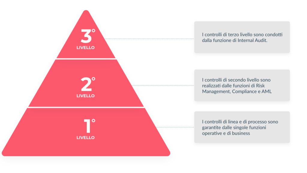 Conformemente alla Normativa di Vigilanza, adottiamo un sistema di controlli interni e di gestione dei rischi articolato su tre livelli di controllo tra loro complementari, che assicurano l’efficienza dei processi aziendali, in coerenza con la strategia definita dal Consiglio di Amministrazione.